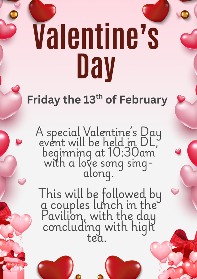 Please find a copy of our February Program from our Lifestyle Manager. We encourage family and friends to join and participate in as many events as possible.